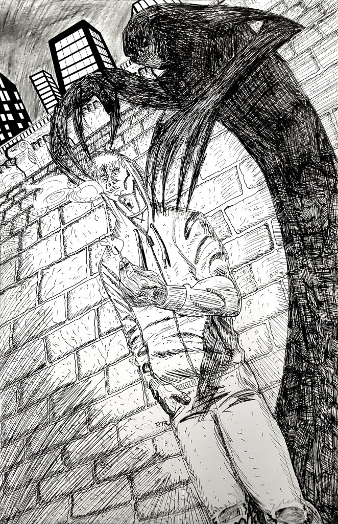 I started as a kid writing and drawing, sometimes I feel like one can’t exist without the other. I mean sure somethings I draw they are just cool or provocative or whatever but there is always a story there, some context where these concepts fit in. If I had to make a story about my life I’m sure I could it’s more of a matter of if anybody would want to read it, y’know? Knew I should’ve gotten into more fights, at the very least that would be fun to draw.